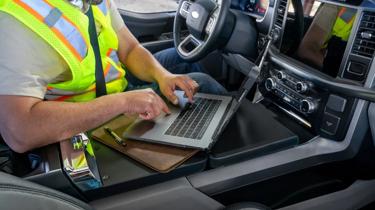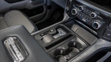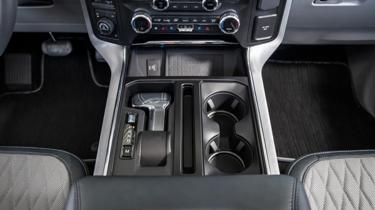 New for 2021, the Ford F-150 can be equipped with a fold-out workspace tray located in the center console cubby. To avoid having the gear lever getting in the way, Ford added a silver button located on the P indicator. Pressing it sends the shifter down into the console, leaving a flush, flat surface to place the tray over. The idea being that F-series drivers can now set a laptop or tablet and turn the truck interior into a mobile office.
