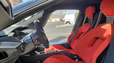 This 2021 Ford GT features exciting, functional exterior components. The hood is exposed carbon fiber in contrast with the car’s Frozen White exterior paint. Race Red color accents and exposed carbon fiber side skirts and rear wing complete the Ford GT Heritage Edition racer-look. As part of the package, every Heritage Edition Ford GT includes roundel graphics throughout the bodywork featuring the number 98 - like the race car. Completing the visual appearance package is a set of forged aluminum wheels in gold. In addition to an ULTIMATE PLUS ™ Paint Protection Film Wrap, the Ford GT Heritage gold wheels were treated with FUSION PLUS ™ Ceramic Coating.
