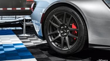The stripe wasn’t the only bit of exposed carbon work either. It was a bit hard to spot from the edge of the velvet ropes, but the Ford GT‘s wheels were optioned in bare carbon fiber. Weighing in a full two pounds lighter than the forged aluminum variant, the carbon wheels are functionally gorgeous. They add an extra $15k to the GT’s sticker price, but will reduce rolling inertia by a whopping 25 percent. At any rate, that’s money well spent.